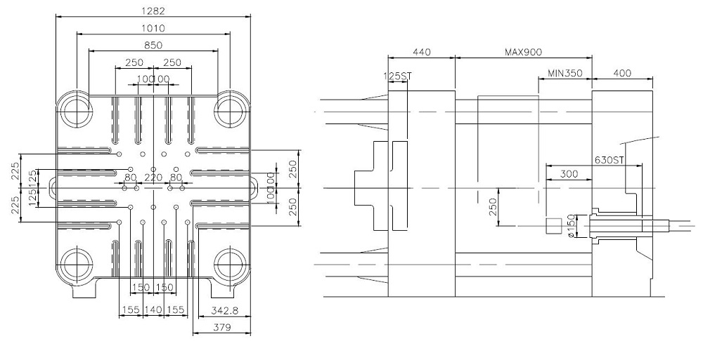 | CLAMPING MECHANISM | Clamping Force Die Platen Tie-bar Distance Die Stroke Die Height | ton mm mm mm mm | 650 1280 x 1280 850 x 850 660 350 – 900 | |||